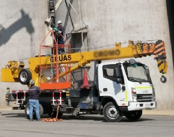 Esta Grúa Pluma tiene una capacidad de 8 toneladas, es marca Cromo, modelo TC8T.Características principales, Largo: 8,50 mts. Alto: 3,10 mts. Ancho: 2,20 mts. (transporte); 6,00 mts. (trabajando) Peso: 9.000 kgs. Largo de la pluma 25,6 metros esta grua funciona tanto a Diesel como conectada a electricidad 380 .
